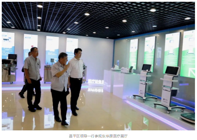 昌平区领导一行在姜黎滨总经理的介绍下,参观了6楼展厅,对东华原医疗中医、医疗产品线自主研发的多种产品做出了高度评价。随后在6楼VIP会议室听取了东华原医疗公司、产品、项目等多方面的介绍。