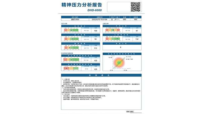 体检场景:东华原心率变异性检测仪的操作界面简洁直观,几分钟即可完成自助检测,生成的“精神压力分析报告”,以直观地色彩和数据范围形式呈现结果,同时在下方提供检测建议,帮助受检者无需专业背景也能快速理解自身压力状态。