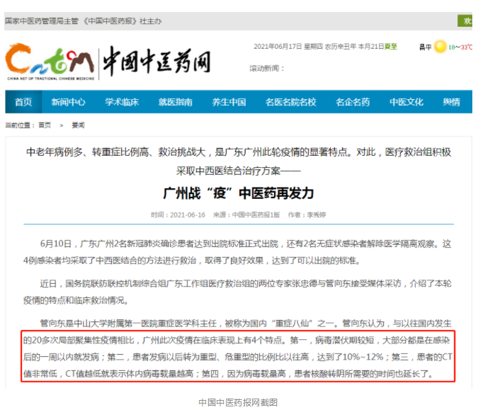 据悉,为了全力以赴地救治患者,国家、省、市三级专家联动成立了医疗救治组,坚持中西医结合协同救治。在中国中医药报的报道中,中山大学附属第一医院重症医学科主任管向东道出了此轮疫情的特殊之处:与以往国内发生的20多次局部聚集性疫情相比,广州此次疫情在临床表现上有4个特点。第一,病毒潜伏期较短,大部分都是在感染后的一周以内就发病;第二,患者发病以后转为重型、危重型的比例比以往高,达到了10%—12%;第三,患者的CT值非常低,CT值越低就表示体内病毒载量越高;第四,因为病毒载量高,患者核酸转阴所需要的时间也延长了。