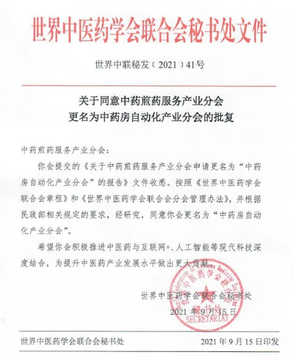 2021年9月15日,经世界中医药学会联合会批复同意,中药煎药服务产业分会正式更名为“中药房自动化产业分会”。自即日起,原分会名称“中药煎药服务产业分会”不再使用。