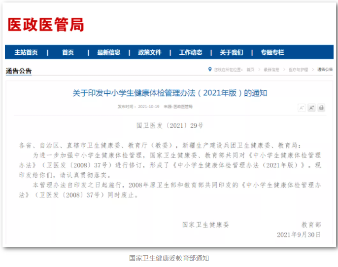 健康前沿 | 2021版中小学生健康体检管理办法发布