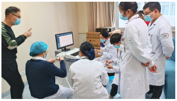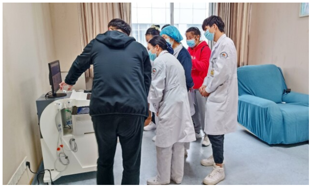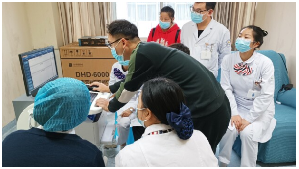 近日,东华原医疗心率变异性检测仪入驻重庆医科大学附属大学城医院。11月11日,东华原医疗区域经理潘延彬等人赶赴医院,为医护人员做设备操作培训。