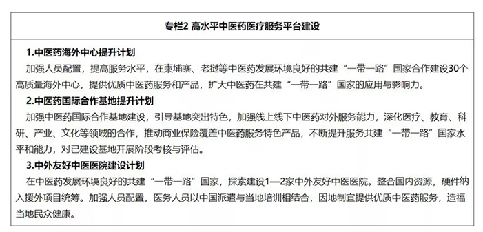 《规划》提出,深化全球卫生治理合作,着力构建传统医学合作伙伴关系。推动中医药纳入更多国家主流卫生体系和政府间合作机制,加大中医药对外援助力度。深化国际组织框架下合作,完善中医药国际标准化体系建设,协调制定国际传统医药标准和监管规则。深化医疗卫生合作,着力增加优质中医药服务供给。加强国际抗疫合作,完善中医药应对国际关注的公共卫生紧急事件机制,加大“三药三方”等有效方剂宣传和推介力度。打造高水平医疗服务平台,向共建“一带一路”国家民众、海外华侨华人、留学生、中资机构人员和赴境外旅行人员等提供优质中医药服务。