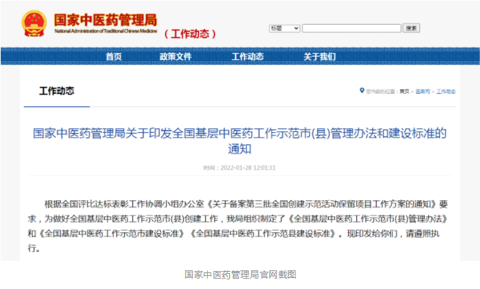 近日,为做好全国基层中医药工作示范市(县)创建工作,国家中医药管理局组织制定了《全国基层中医药工作示范市(县)管理办法》和《全国基层中医药工作示范市建设标准》《全国基层中医药工作示范县建设标准》。