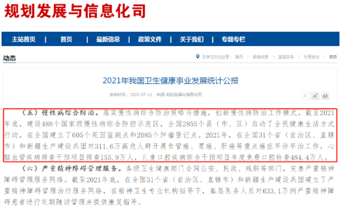 此前,国家卫健委发布的《2021年我国卫生健康事业发展统计公报》显示,我国慢性病综合防治取得了一定成果。“落实慢性病综合防治策略与措施,创新慢性病防治工作模式。截至2021年底,建设488个国家级慢性病综合防控示范区,全国2855个县(市、区)启动了全民健康生活方式行动……心脑血管疾病筛查干预项目筛查155.9万人。”