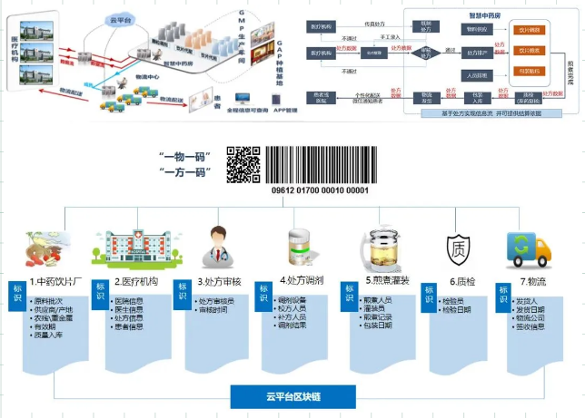 二是利用区块链技术,促进数据共享安全与合规监管。构建智能代配、代煎大数据要素融合服务平台,中药煎药中心通过与医疗机构、中药饮片厂、配送公司等各方的合作与数据授权,融合中药饮片厂的中药生产信息、医疗机构的处方信息、煎药中心的煎煮灌装信息、配送公司的配送信息等,利用区块链技术将数据同步存储到区块链节点中,在代煎各环节进行数据来源验证,将传统人工调剂模式升级为“全流程数据追溯+人工+智能自动化”的新调剂模式,推动实现处方精准调配、中药安全代煎,应用覆盖浙江、广东、上海、重庆、山东、湖北、江苏、广西、重庆、福建等21个省市,120家中药煎药中心和3500家医疗机构。