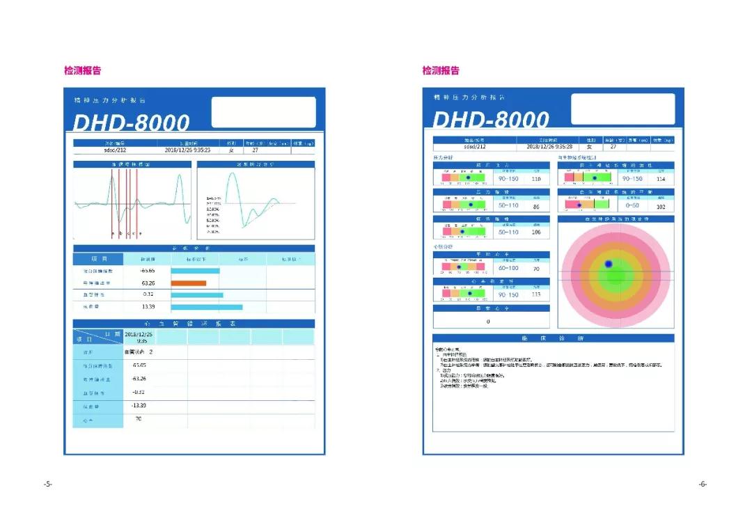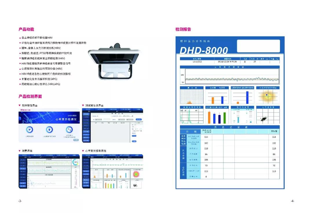 软件上:新增心血管循环评估系统。操作过程5分钟,即时获得几十项参数的检测报告;全程无创非侵入性检测,无辐射;科学准确自动生成HRV全面分析报告评估整体心理健康状况。