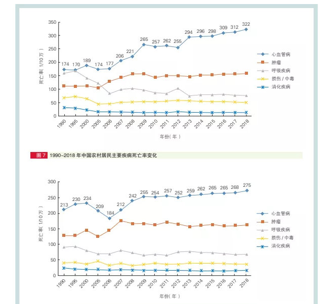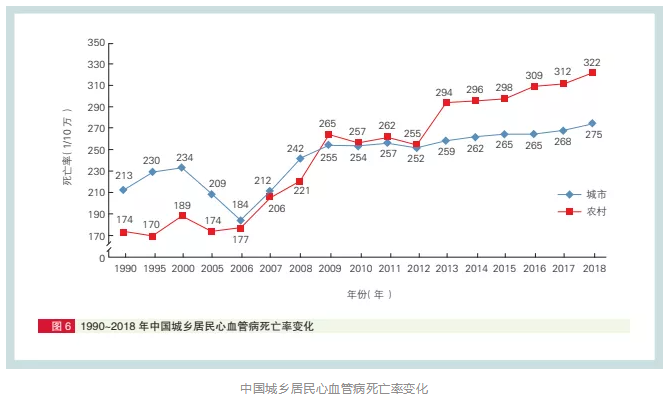 中国心血管病患病率处于持续上升阶段。2018年,心血管病死亡率仍居首位,高于肿瘤及其他疾病。农村心血管病死亡率从2009年起超过并持续高于城市水平。