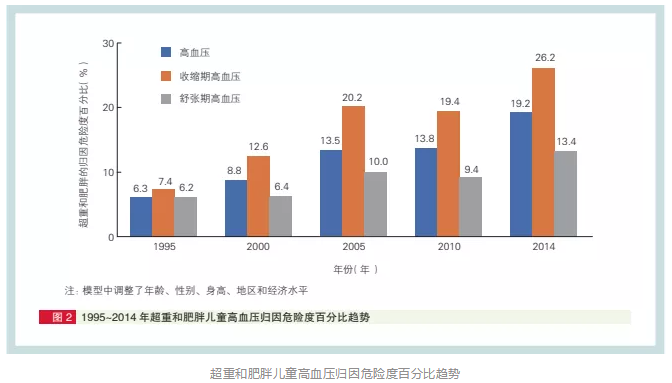 2010年全国学生体质调查显示,中国学龄儿童高血压患病率为14.5%,男生高于女生(16.1%vs.12.9%)。中国健康与营养调查1991—2015年九次现况调查,地区学龄儿童高血压患病率从1991年的8.9%上升到2015年的20.5%。而肥胖是儿童青少年原发性高血压的第一位危险因素。