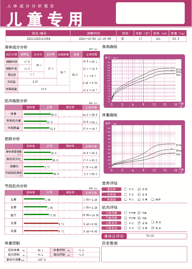 东华原人体成分分析仪儿童专用报告包括测量者的营养评估、身体成分评估、身高曲线、体重曲线、肥胖分析与身体总评分等多项解析。让儿童在专业数据的监测下更加健康地成长。
