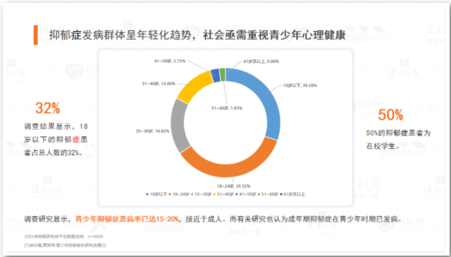 用户调研结果显示,62.36%的人经常感到抑郁,情绪压力和亲子关系是引发抑郁症的主要社会环境因素,其次为亲密关系和职业发展。而且,抑郁症发病群体呈年轻化趋势。蓝皮书调查数据显示,青少年抑郁症患病率为15%-20%;在抑郁症患者群体中,50%为在校学生,其中41%曾因抑郁休学。
