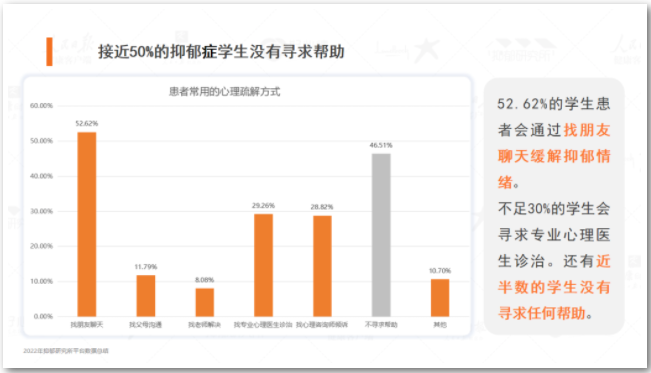 蓝皮书还透露,有一半的抑郁症学生患者会通过朋友倾诉、父母沟通或其他渠道进行求助,但仍有46%的学生没有寻求任何帮助,近30%从未想过寻求专业心理医生的帮助。
