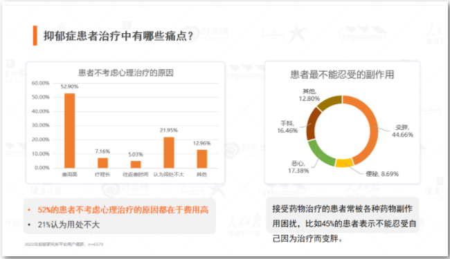 蓝皮书显示,抑郁症患者治疗中存在诸多痛点。“费用高”是阻挡患者长期接受心理治疗的“拦路虎”。在接受药物治疗的患者中,“变胖”“恶心”“手抖”“便秘”等副作用成为其高度关注的问题。