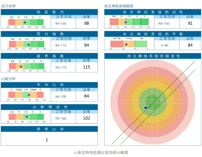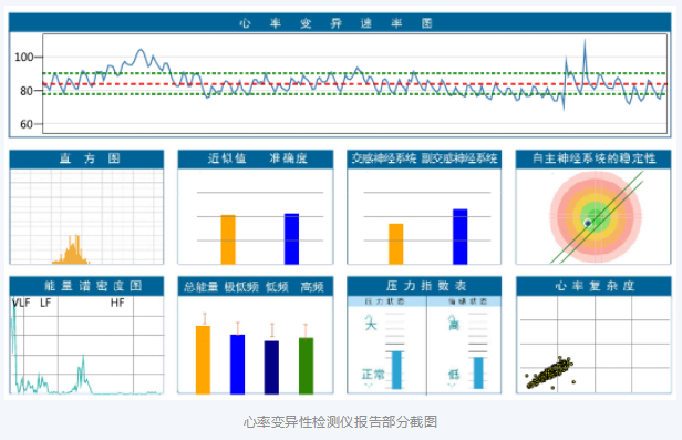 心率变异速率图:当机体处于受压力的情况下,心率增加,心率变异性减小,提示此时集体健康状态有待提高。 直方图:心率变异性越小,直方图底面越狭窄,上端越尖锐。心率变异性大则底面宽,顶端较平。 散点图:表示心率变异性程度,以某一个NN间期为横坐标,以相邻的下一个NN间期为纵坐标绘制而成。心率变异性越小,散点分散越窄,呈短棒形。心率变异性越大,散点扩散范围越广而分散,成彗星状。 能量谱图:评价对象为自主神经系统、交感神经和副交感神经活性程度。 自主神经系统对比图:交感神经兴奋:焦虑、恐惧、分心、愤怒、易觉醒;副交感神经兴奋:无助、慢性神经衰弱、警觉性降低。 自主神经系统平衡图:反映交感神经和副交感神经之间整体平衡的程度,中心圆圈为正常范围,异常时从中心向外移动。 近似值/准确度:近似值(ApEn)用于观察时域分析中信号的复杂程度,并通过统计方法定量化处理数据。指的是HRV波形中除去周期性成分以外的非周期性波形成分的复杂程度。健康人的HRV信号的ApEn较大,数值一般不会超过2,越接近2越好。 准确度(SRD)是用于确认检测结果数值是否维持了一定的稳定性,有无可读性。若数值上得出1左右(约0.8~1.2)时,各监测参数的状态已维持并可进行解读。
