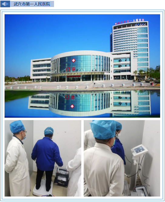 武穴市第一人民医院坐落在大别山南麓、风景秀丽的武山湖畔,前身是1927年英籍传教士所创的“普爱医院”。1950年建院后,经过几代武医人的艰苦创业,现已建成武穴市规模最大、设施齐全、技术力量雄厚的集医疗、科研、教学、预防保健、120急救中心于一体的花园式三级综合医院。上图中科室专家亲自体验测试设备,并对设备的检测情况给予了高度评价。
