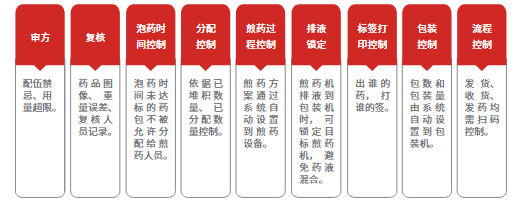 全流程扫码管理,可对药品批次、产地等信息、药品质量报告、煎煮全流程信息、各环节操作人员及设备溯源,建立了严格的全流程追溯体系。
