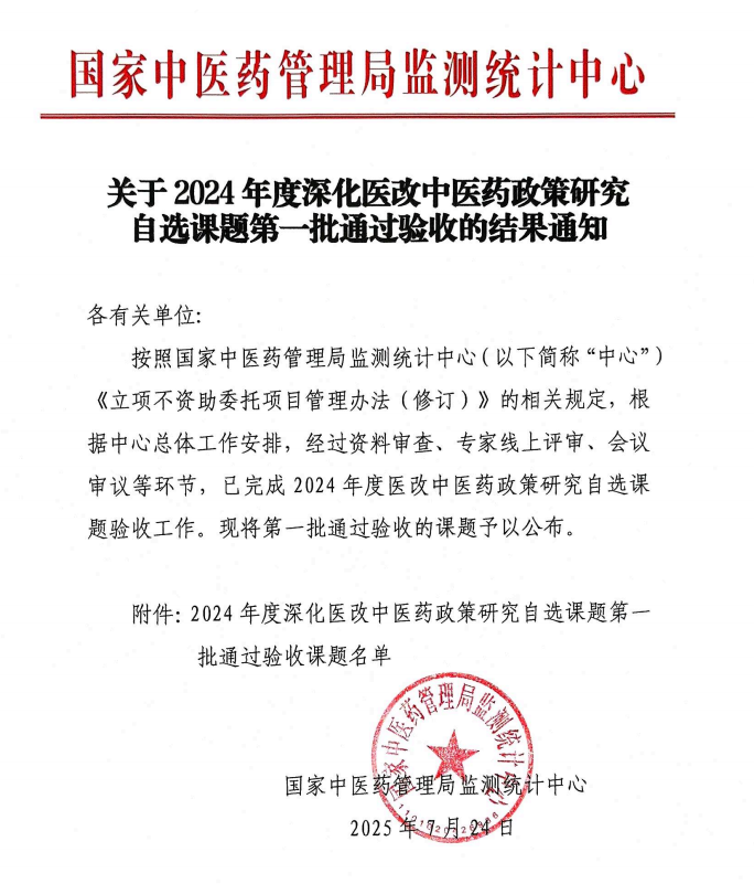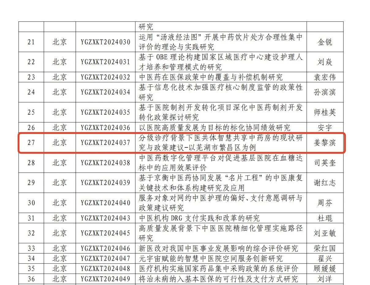 近日,国家中医药管理局监测统计中心发布《关于2024年度深化医改中医药政策研究自选课题第一批通过验收结果的通知》文件,公布了2024年度第一批通过验收的课题名单,乐动注册总经理姜黎滨申请的《分级诊疗背景下医共体智慧共享中药房的现状研究与政策建议-以芜湖市繁昌区为例》课题项目通过验收。