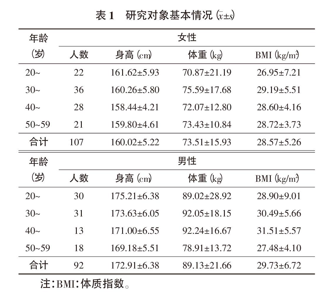 1.2 测量方法按照身高体重测试仪、人体成分分析仪、骨密度仪的先后顺序依次测量。身高和体重测量:采用由北京东华原医疗生产的DST-600 型全自动身高体重测量仪进行身高和体重测量,体重测量精度±200 g,身高测量精度±1 mm。人体成分分析仪测试:使用北京东华原医疗生产的DBA-550 型多频生物电阻抗人体成分分析仪,包括1、5、50、250、500 和1 000 kHz 共6 个频率,测量项目包括:细胞内液、细胞外液、总水分、蛋白质、无机盐、体脂肪、体重、肌肉量、去脂体重、骨骼肌肉量、体质指数(BMI)、体脂肪率、腰臀比、内脏脂肪面积和浮肿指数等。测量时间选择上午9: 00-12: 00 或下午15: 00-17: 00,研究对象空腹或测前2 h 禁食,排空小便,禁止剧烈活动,赤足,单衣,禁止携带较重物品及饰物,测试时室内环境温度保持在24~26 ℃。测量前保持站立姿势约5 min。具体操作由专业人员负责。骨密度仪测试:采用美国GE 公司iDXA 双能X 射线骨密度仪,选择全身扫描,测量前受检者着单衣,去除任何带金属、纽扣、拉链的高密度衣物,具体操作由临床
