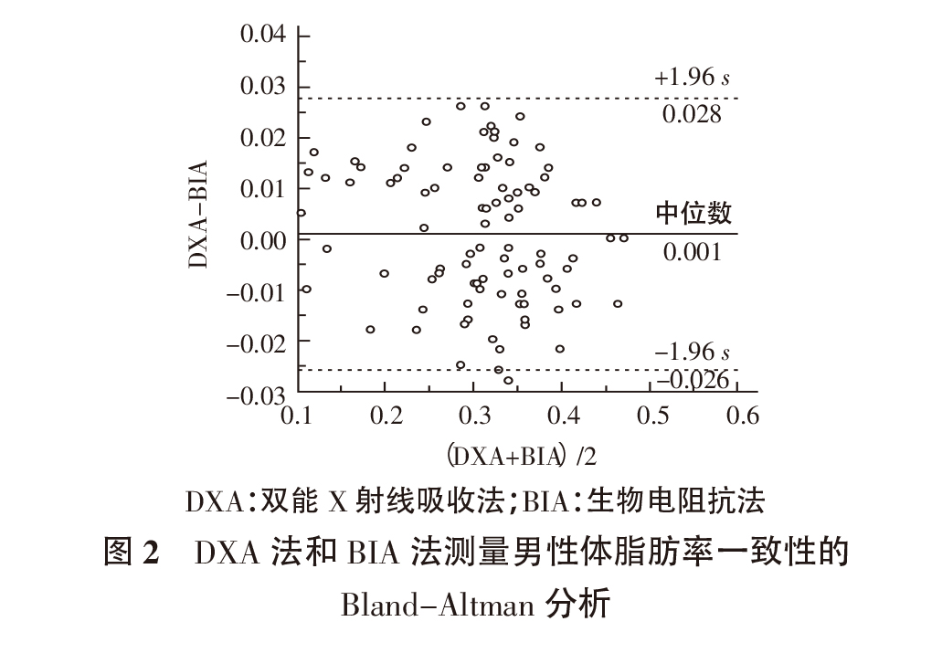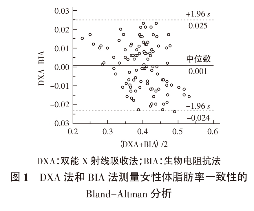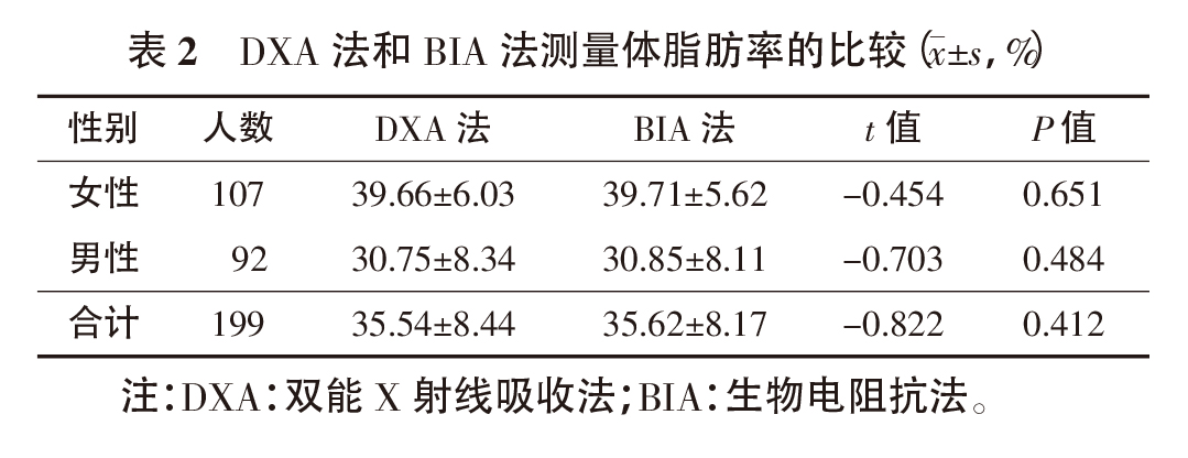 2.1 BIA 与DXA 测量体脂肪率的比较DXA 和BIA测得的女性、男性及全部受检人员的体脂肪率的差异均无统计学意义(t 值分别为-0.454、-0.703 和-0.822,P>0.05),见表2。