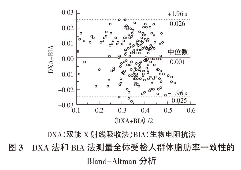 2.3 BIA 与DXA 测量体脂肪率的一致性分析由图1 可见,107 个点中只有1 个位于一致性界限范围以外,比例为0.94%,小于5%。在一致性界限范围内,人体成分分析仪的BIA与DXA 测量结果差值的绝对值最大为0.024,2种方法测量女性体脂肪率的平均值为0.397,这种相差的幅度在临床上可以接受,因此,可以认为,2种方法测量的结果具有较好的一致性。由图2 可见,92 个点中有2个位于一致性界限范围以外,比例为2.17%,小于5%。在一致性界限范围内,BIA 与DXA 测量结果差值的绝对值最大为0.028,2种方法测量男性体脂肪率的平均值为0.310,这种相差的幅度在临床上可以接受,因此,可以认为2 种方法测量的结果具有较好的一致性。由图3 可见,199 个点中只有3 个位于一致性界限范围以外,比例为1.51%,小于5%。在一致性界限范围内,BIA 与DXA 测量结果差值的绝对值最大为0.028,2 种方法测量全体人群体脂肪率的平均值为0.360,这种相差的幅度在临床上可以接受,因此,可以认为2 种方法测量的结果具有较好的一致性,2种方法在临床上测量脂肪率时可以互相代替使用。