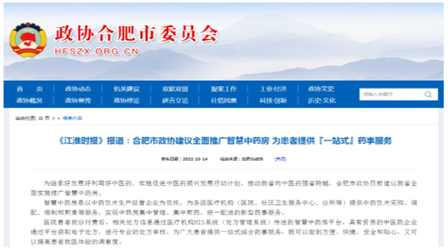 《江淮时报》:合肥市政协建议全面推广智慧中药房